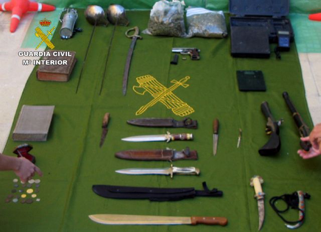 La Guardia Civil ha practicado dos registros domiciliarios en Albudeite donde se han incautado medio kilo de cogollos de marihuana, básculas de precisión, una pistola modificada y munición; así como monedas y varias armas blancas antiguas.